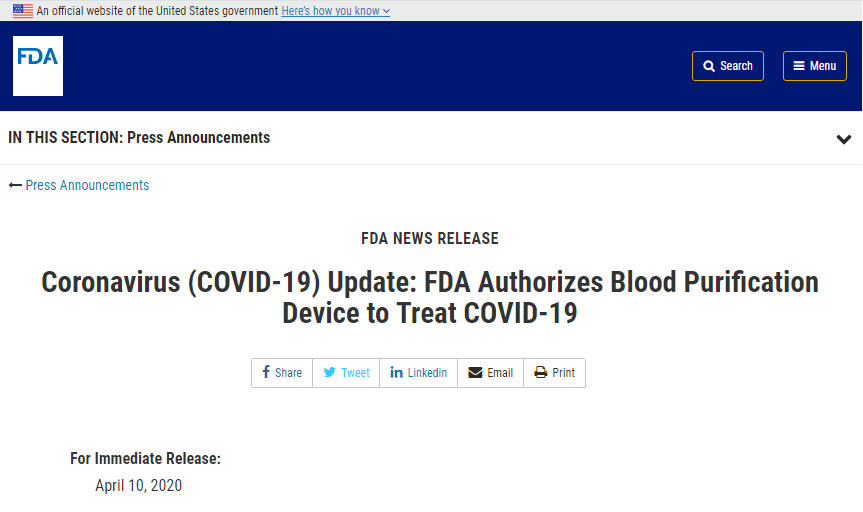 2020年4月10日,美国食品和药物管理局发布了一项血液净化系统的EUA(应急使用授权),用于治疗已确诊患有2019冠状病毒(COVID-19)的18岁或18岁以上的患者,该病人是已确诊或即将出现呼吸衰竭,被送往重症监护病房(ICU)的患者。