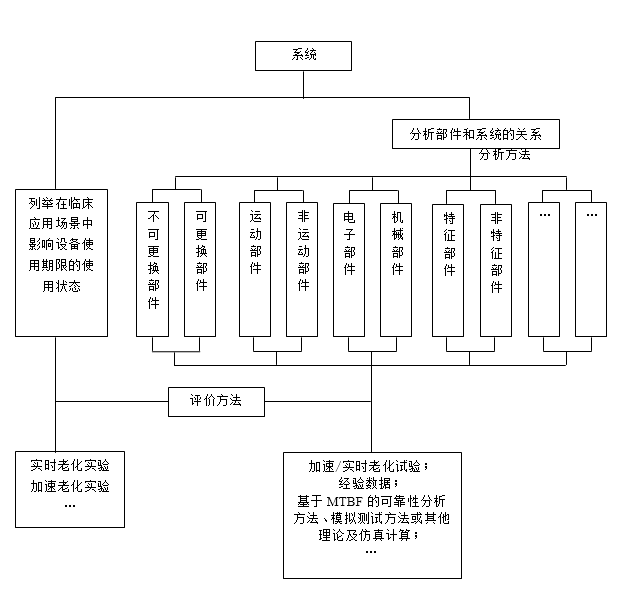 对于不适宜进行整机测试的复杂有源医疗器械设备或系统,可通过将设备分解为不同部件的评价路径对其进行评价。首先应详细分析系统与部件的关系,在此基础上通过不同的分解方式(如将系统分为关键部件及非关键部件、特征部件及非特征部件、可更换部件及不可更换部件、运动部件及非运动部件、电子部件及机械部件等)确定整机的使用期限。(详见图1)