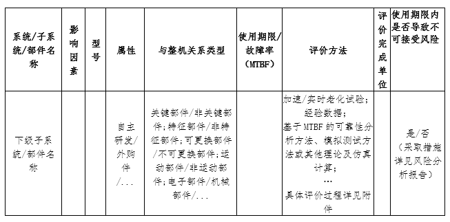 关键电子部件的使用寿命分析可以依据可靠性分析来评估。例如:中华人民共和国国家军用标准“GJB/Z 299C-2006——电子设备可靠性预计手册”中的方法,如有其他同类型的标准也可以参考。机械部件的使用寿命分析可以采用寿命加速实验或者直接进行临床场景累计实验。例如:预期机械臂在10年内伸缩10万次,那么可以通过10万次机械实验之后观察机械臂的状态得出结论。进行加速实验的部件,需制定加速实验的理论模型,给出加速因子的计算方法。
